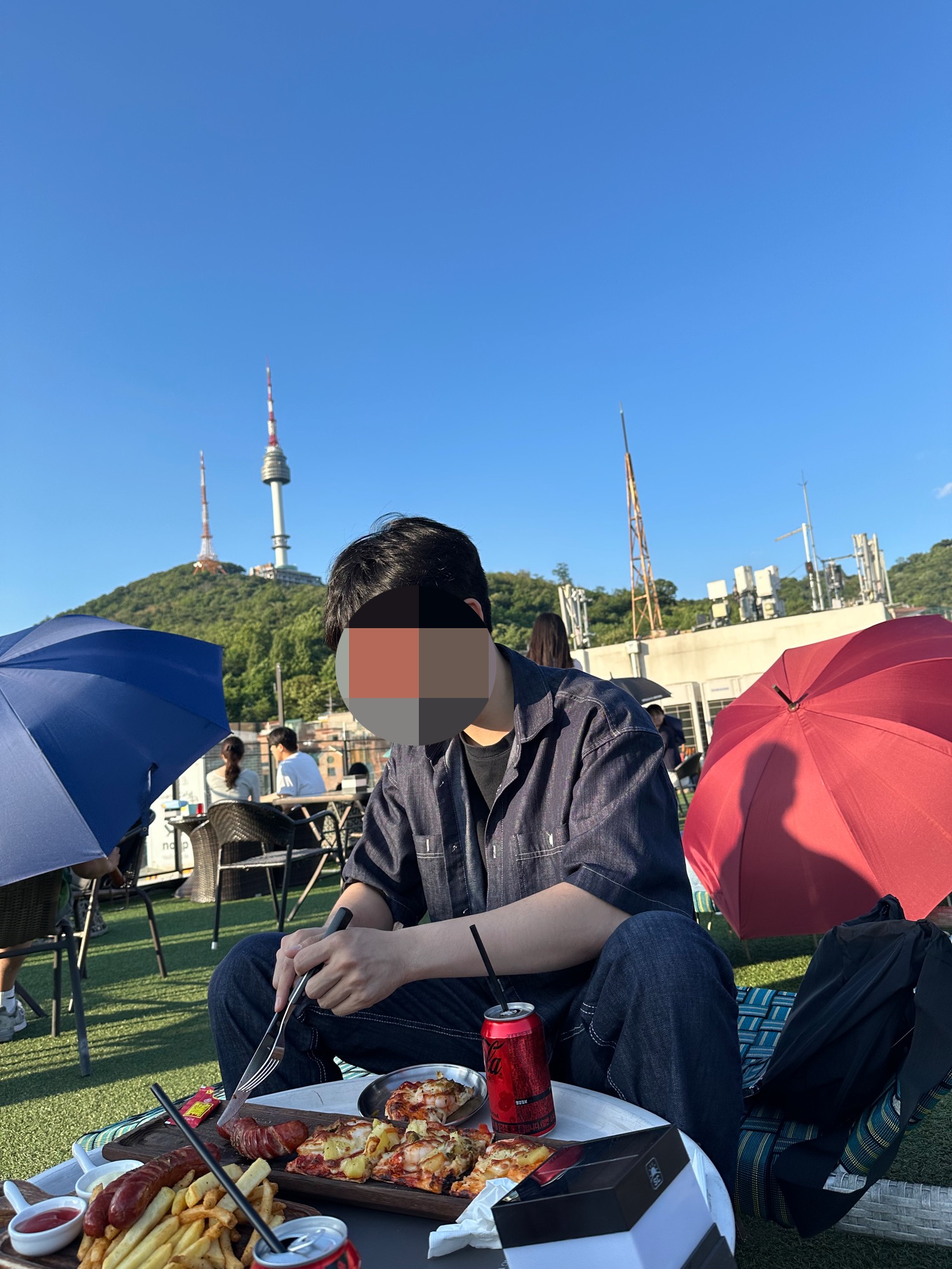 야외테이블에 앉아서 술과 음식을 먹고 있었어요!